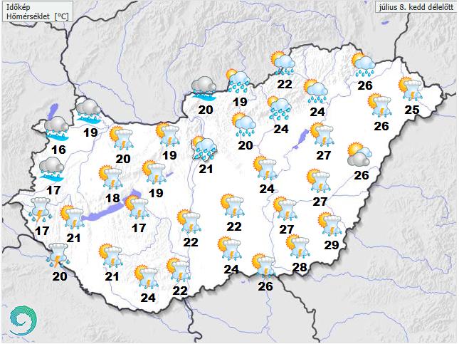 Sok helyen valószínű zápor, zivatar, valamint heves zivatarok is kialakulhatnak hazánk délkeleti felén. A szél egyre nagyobb területen északnyugatira, nyugatira fordul és megerősödik, míg zivatarok környezetében viharos lökések, heves zivataroknál akár károkozó szélrohamok is lehetnek. A legmagasabb nappali hőmérséklet általában 22 és 30 fok között alakul, de a Tiszántúlon 30 fok fölé is melegedhet a levegő, míg a nyugati határvidéken hűvösebb maradhat az idő. Késő estére 14 és 21 fok közé hűl le a levegő.