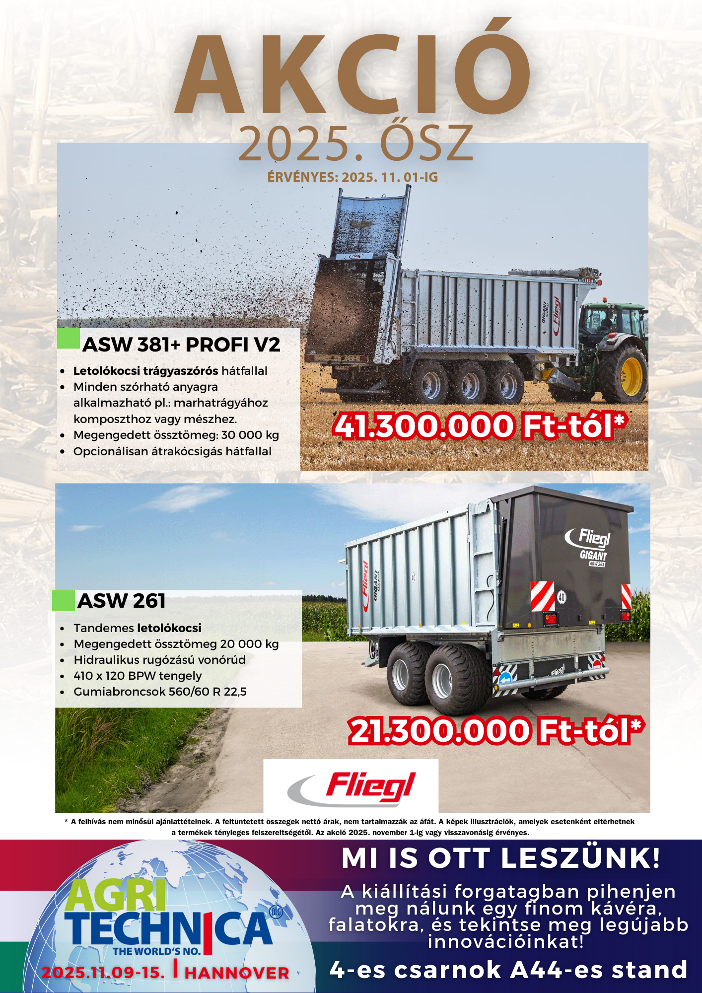 Az Őszi Akció keretében 2025. november 1-ig, vagy a készlet erejéig kedvezményes áron juthat hozzá a Fliegl legnépszerűbb pótkocsijaihoz és adaptereihez. Az ajánlat azoknak szól, akik előre gondolkodnak, és szeretnének modern, megbízható eszközökkel hozzájárulni gazdaságuk gördülékeny működéséhez.