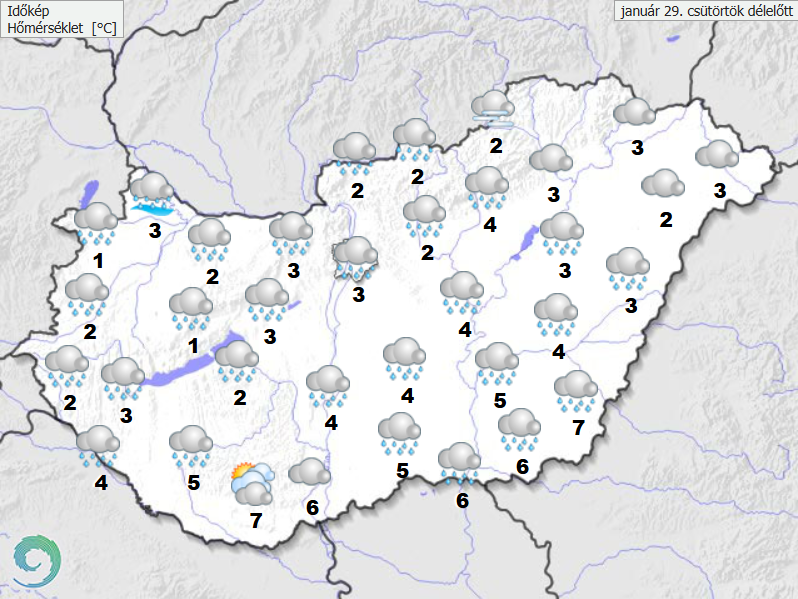 Általában borult, több helyen párás idő várható, inkább csak kevés helyen vékonyodhat, szakadozhat esetleg a felhőzet. A csapadékzóna lassan gyengülve az ország északi, északkeleti felére húzódik jellemzően esőt okozva. Többnyire mérsékelt lesz az északiasra forduló szél. A legmagasabb nappali hőmérséklet nagyrészt 2 és 7 fok között valószínű, de nagyobb eséllyel délen ennél magasabb értéket is mérhetünk. Késő este 0, +5 fok várható.