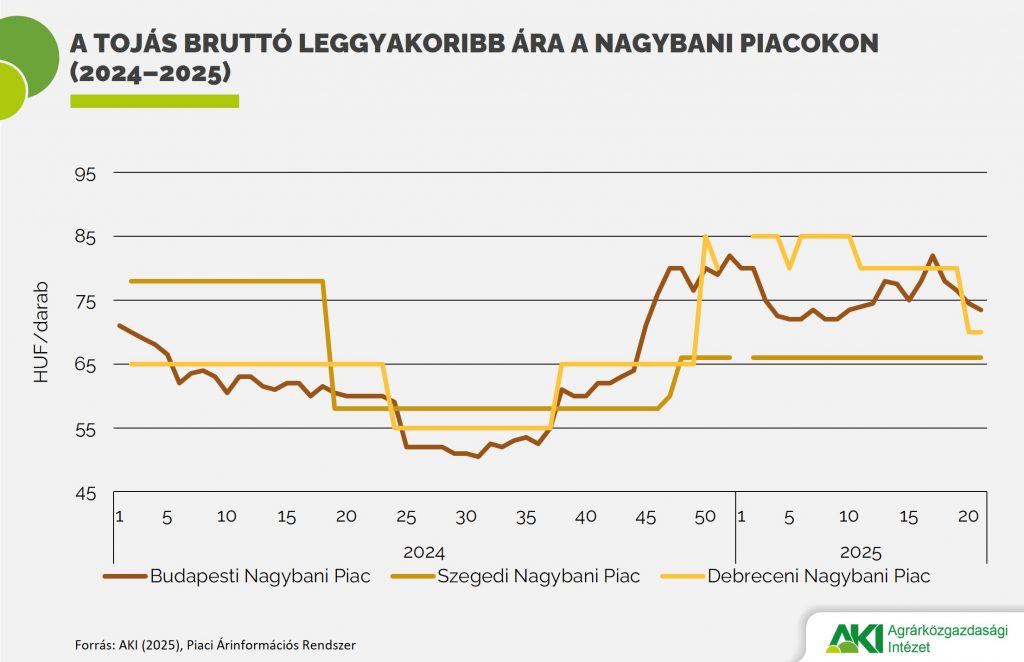 Az AKI PÁIR adatai szerint Magyarországon a ketreces tartásból származó étkezési tojás (M+L) csomagolóhelyi ára 67,02 forint/darab volt 2025 első húsz hetében, ami 26,7 százalékkal múlta felül a 2024. év azonos időszakának átlagárát. Az M méretosztályú dobozos tojás csomagolóhelyi ára 23,5 százalékkal 69,37 forint/darabra, az L méretosztályú dobozos tojásé 22,1 százalékkal 79,97 forint/darabra emelkedett. Az M-es tálcás tojás csomagolóhelyi ára 29,8 százalékkal 61,43 forint/darabra, az L-es tálcás tojásé 30,7 százalékkal 66,37 forint/darabra nőtt. A mélyalmos tartásból származó étkezési tojás (M+L) csomagolóhelyi ára 75,57 forint/darab volt 2025 első húsz hetében, ami 24,3 százalékkal magasabb a 2024. év azonos időszakának átlagáránál.