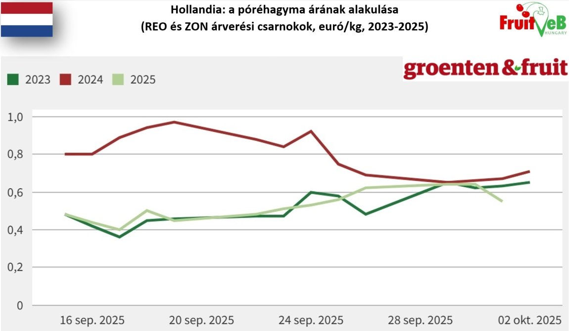 A hollandiai aukciókon a póréhagyma ára az elmúlt időszakban erős hullámzást mutatott: Venlóban az árverési ár rövid időre elérte a 0,70 eurót (273 HUF), majd visszatért az 0,50–0,55 eurós (195–215 HUF) sávba egy újabb emelkedés előtt. A piaci mozgások alapján középtávon inkább emelkedés, semmint csökkenés figyelhető meg. A REO aukcióin október 1-jén jelentős mennyiségű Flandria fajtájú póréhagymát értékesítettek kiemelkedően magas árakon: egyes tételek az 1,00 eurót (390 HUF) is meghaladták. A REO szerint a termékek kedvező fogadtatása és a Flandria póréhagyma kiváló minősége magyarázza az árak emelkedését. Október következő napjain viszont az árak már némi csökkenést mutattak.