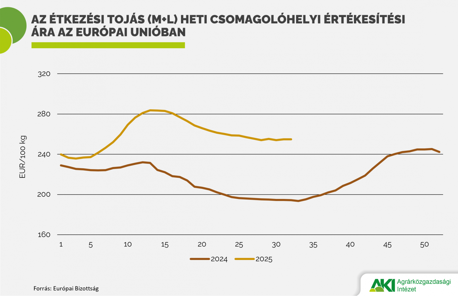 Az AKI PÁIR adatai szerint Magyarországon a ketreces tartásból származó étkezési tojás (M+L) csomagolóhelyi ára 63,97 forint/darab volt 2025 első harminckét hetében, ami 30,3 százalékkal múlta felül a 2024. év azonos időszakának átlagárát. Az M méretosztályú dobozos tojás csomagolóhelyi ára 28,0 százalékkal 66,78 forint/darabra, az L méretosztályú dobozos tojásé 26,0 százalékkal 77,17 forint/darabra emelkedett. Az M-es tálcás tojás csomagolóhelyi ára 31,5 százalékkal 57,81 forint/darabra, az L-es tálcás tojásé 35,9 százalékkal 63,97 forint/darabra nőtt. A mélyalmos tartásból származó étkezési tojás (M+L) csomagolóhelyi ára 72,87 forint/darab volt 2025 első harminckét hetében, ami 26,9 százalékkal magasabb a 2024. év azonos időszakának átlagáránál.