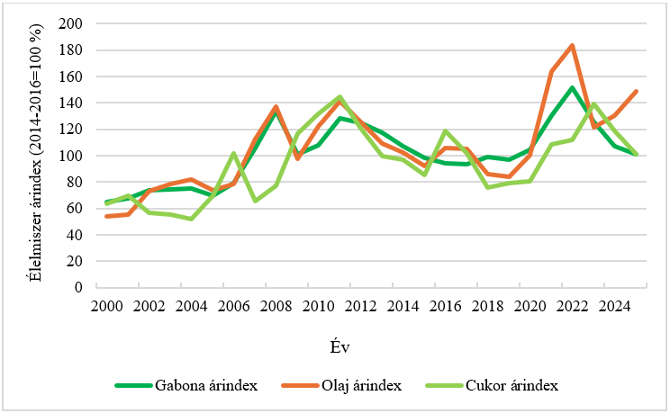 Forrás: NAK 2. ábra: Gabona-, növényi olaj- és cukor árindex 2000 és 2025 között