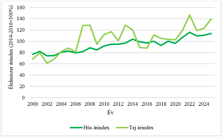 Forrás: NAK 3. ábra: Hús- és tejtermék árindex 2000 és 2025 között
