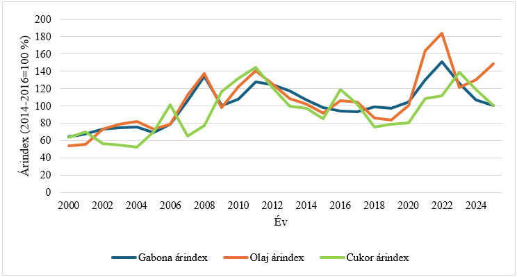 2. ábra: ábra: Gabona-, növényi olaj- és cukor árindex 2000 és 2025 között