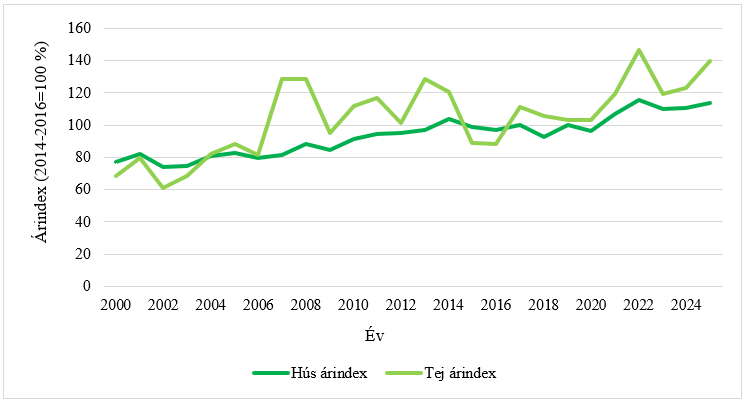 3. ábra: Hús- és tejtermék árindex 2000 és 2025 között
