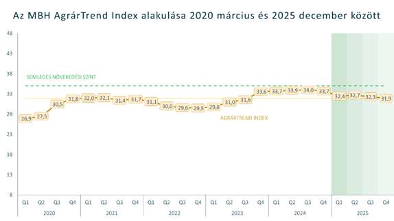 Az ügyfelek, szakmaközi szervezetek és a bank elemzőinek helyzetértékelése alapján készülő, és a hivatalos statisztikákat megelőző agrár-élelmiszeripari bizalmi mutató, az MBH AgrárTrend Index értéke 2026 elején 31,9 pontot mutatott a 48 pontos skálán, ezzel némileg tovább távolodott az egyensúlyi szintnek tekintett 35 ponttól: a tavaly szeptemberrel zárult negyedév után 2025 utolsó három hónapjában további 0,4 ponttal mérséklődött. Az érték legutóbb 2023 év végén volt hasonlóan alacsony szinten, akkor azonban főként a gyenge terménypiaci árszint miatt, míg most elsősorban a tej- és a sertéspiaci kihívások vezettek csökkenéshez.