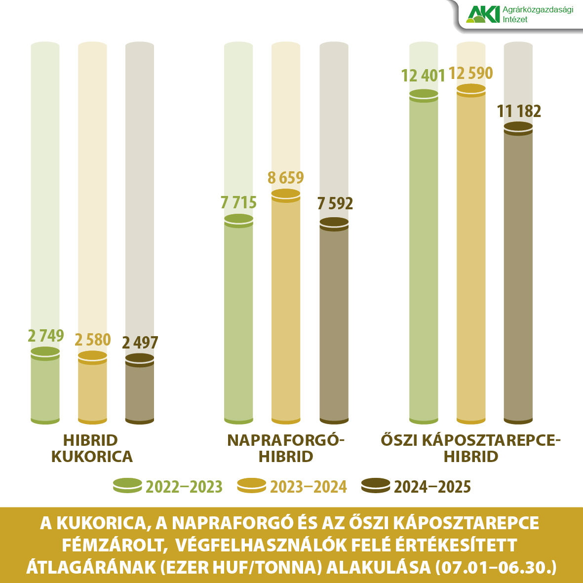 Őszikáposztarepce-hibridet 2024-ben 10 fajta felhasználásával 404,5 hektár szaporítóterületen állítottak elő, kétszer akkora területen, mint egy évvel korábban, és 3610 tonna alapanyagot fémzároltak. 2025 őszén 153,1 ezer hektáron termesztettek őszi káposztarepcét, amelynek alapanyag-szükséglete megközelítőleg 460 tonna fémzárolt vetőmag volt (3 kilogramm/hektár vetőmagnormával számolva). Az ezen felül maradó vetőmagtételek az export árualapját képezték. Az éves forgalmazott mennyiség 500 tonnát tett ki a beérkezett adatok alapján. Egy tonna őszikáposztarepce-hibridért átlagosan 11 182 ezer forintot fizettek a végfelhasználók 2024 őszén, 11 százalékkal kevesebbet, mint egy évvel korábban.