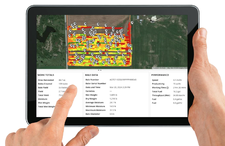 Gondoljunk csak bele, hányszor előfordul, hogy vissza kell menni a területre megszámolni a bálákat, vagy telefonon kell hívogatni a gépkezelőket, hogy melyik terület mennyi bálát adott. Az automatikus dokumentálással ennek vége, pontos információ lesz arról, melyik táblán mekkora méretű, milyen nedvességtartalmú (nedvességmérő-opció kiválasztása esetén) és hány darab bála készült. Megkönnyítve ezzel a szolgáltatók, irodában dolgozók számlázási munkáit is.
