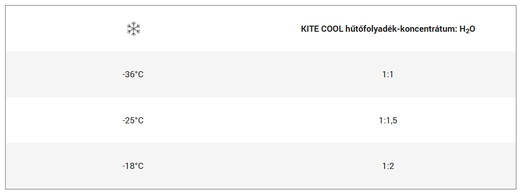 A KITE COOL hűtőfolyadék-koncentrátum keményvízálló, ezért a hűtőrendszer feltöltése előtt csapvízzel is hígítható olyan arányban, hogy 33-55 tf% közötti koncentrációjú oldatot kapjunk. A hűtőfolyadék a kemény vizet is tolerálja, maximum 500 ppm kalcium-kloridot (CaCl₂) tartalmazó keményvizes oldat esetén is használható.