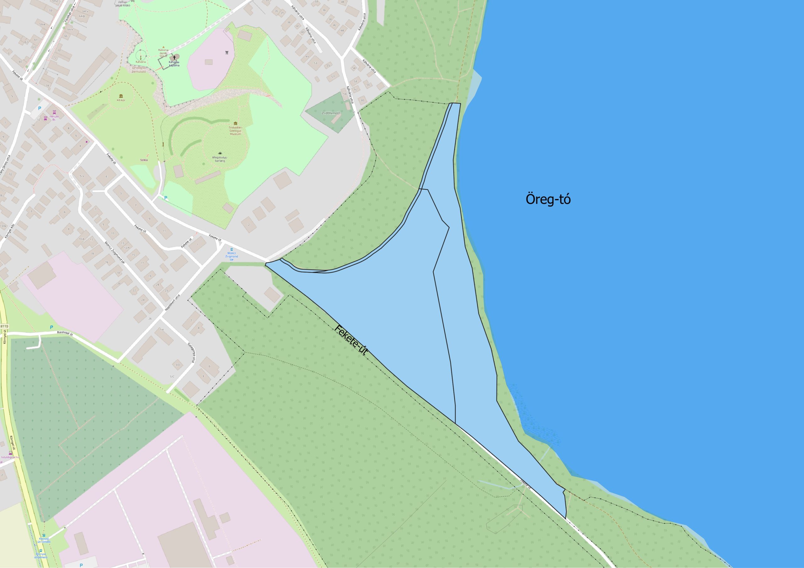 A tatai projekt első ütemének középpontjában az erdő egészségi állapotának javítása, valamint a látogatók biztonságának erősítése áll. A területen megtörtént a faállomány részletes felmérése; a szakemberek külön figyelmet fordítottak a korhadt, idős, kéreg nélküli, illetve egészségi állapotukban leromlott fák azonosítására. A felmérés eredményei alapján most megkezdődik a beteg egyedek célzott eltávolítása – nemcsak a sétautak közvetlen környezetében, hanem az erdő belső területein is: ahol az állapotromlás ezt indokolja. Ez a beavatkozás egyszerre csökkenti a balesetveszélyt, és segíti azt is, hogy az erdő megújulása stabilabban indulhasson el. Az érintett terület világoskék színnel az alábbi térképen látható: